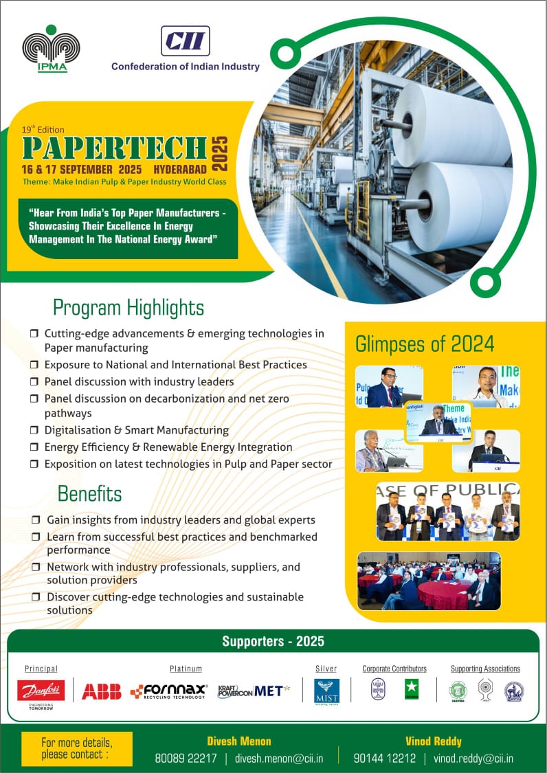 In continuation of this initiative, CII-GBC in partnership with Indian Paper Manufacturers Association (IPMA) , is organizing the 19th Edition of PaperTech 2025 on 16 & 17 September, 2025 at Hyderabad. The theme for this year event is ‘Making Indian Pulp & Paper Industry World Class’.